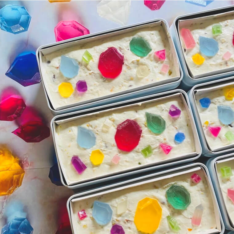 An ice cream cake with a ricotta cheese base cream and sparkling amber sugar trapped inside.