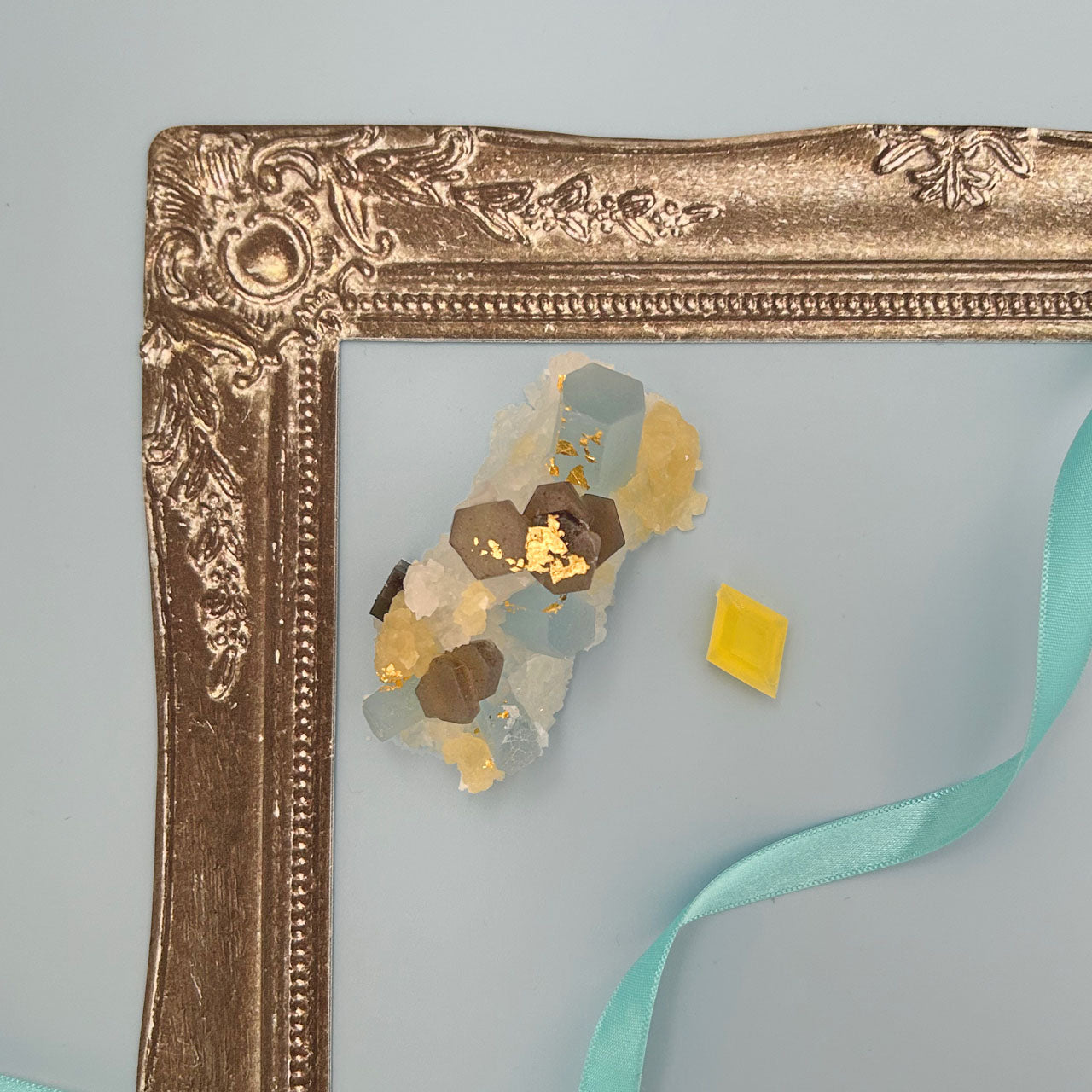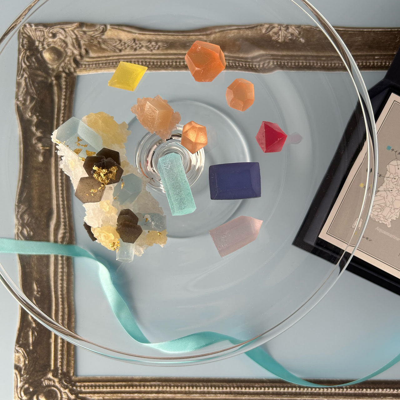 3月の誕生石である、『アクアマリン』『アイオライト』『珊瑚』を手切りの琥珀糖で表現しました。