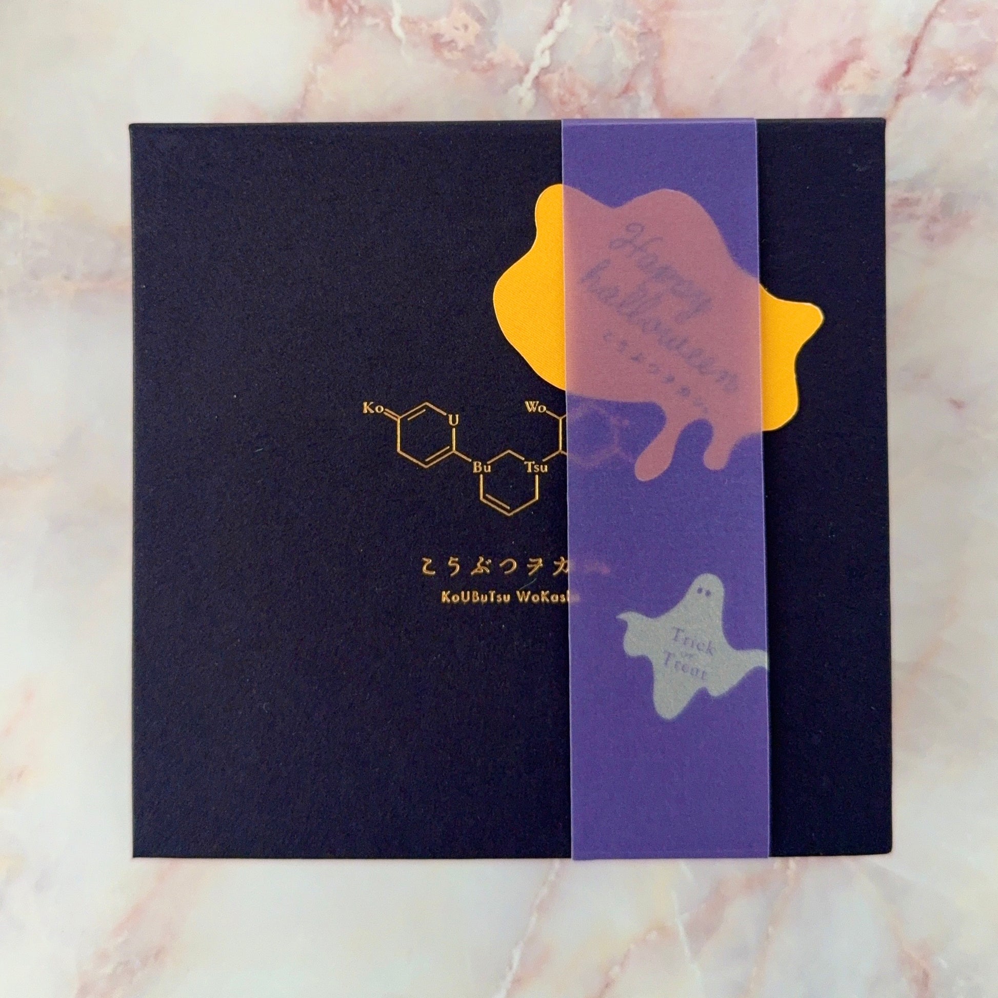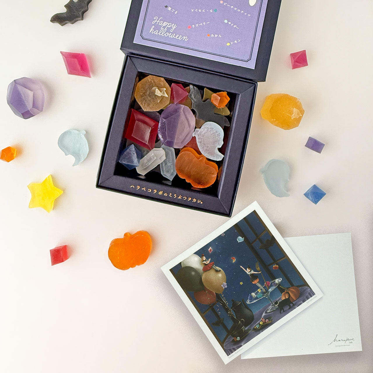 箱の中に、イラストレーターのSakikoさんが描いたイラストのハロウィンカードをお入れしています。
