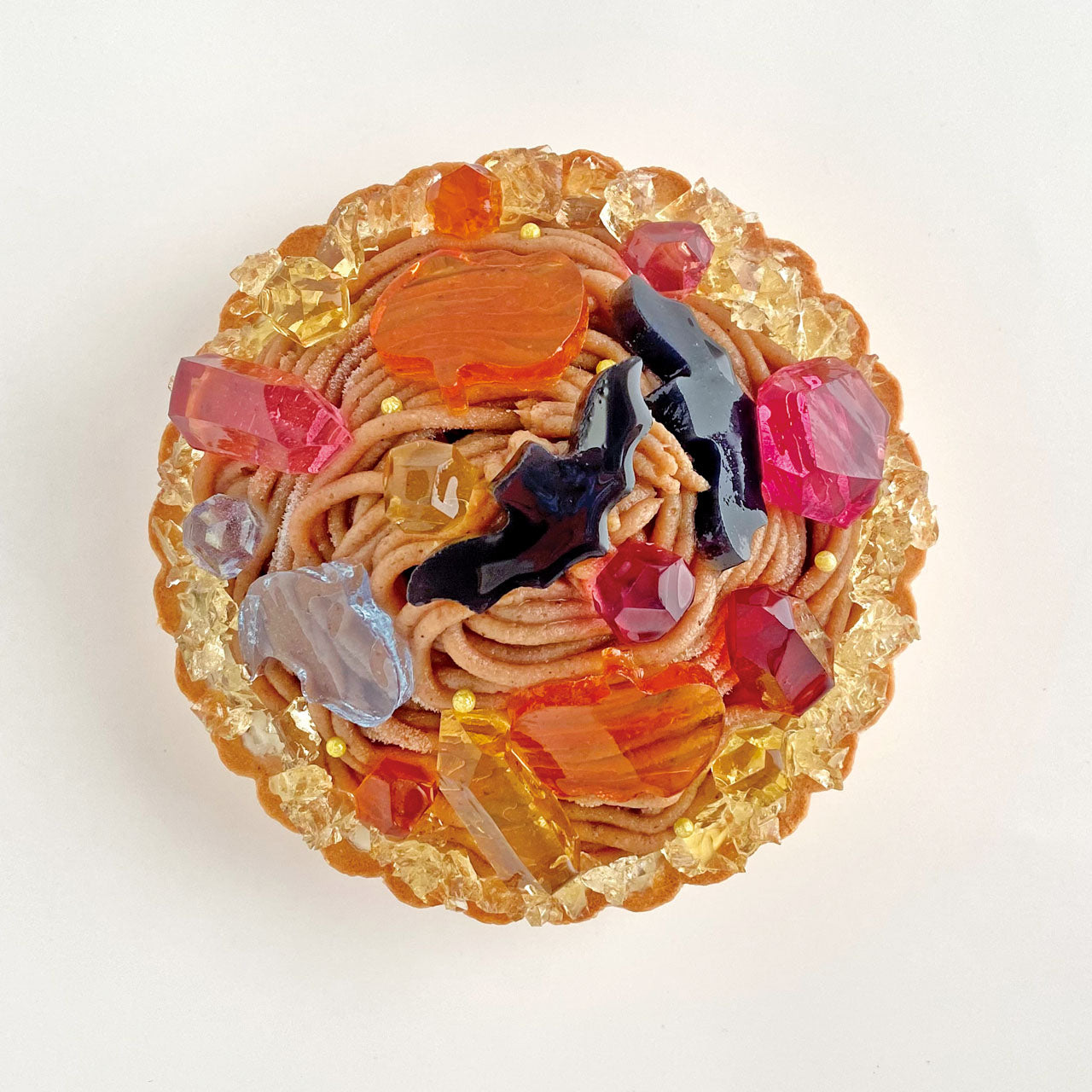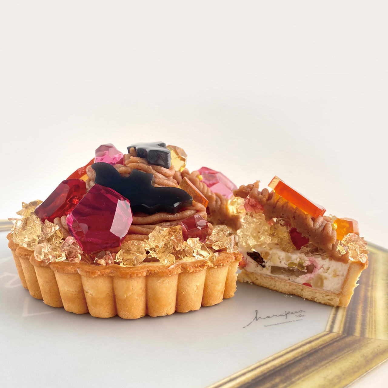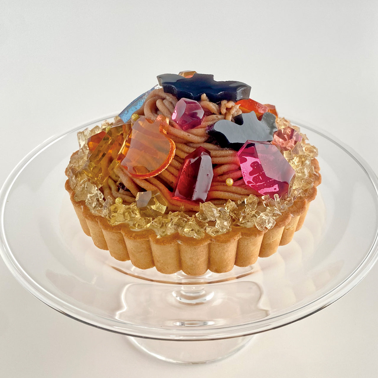原材料名:砂糖(国内製造)、タルト(小麦粉、マーガリン、糖類(砂糖、果糖ブドウ糖液糖)、鶏卵、アーモンド、乳清たんぱく、食塩)、クリーム、マロンペースト、乳等を主原料とする食品(生乳、乳清、クリーム)、ホワイトチョコレート、レモンピール、カシューナッツ、ビターチョコレート、ピスタチオ、ラズベリー、すぐり、寒天、アラザン、みかん果汁、いちごピューレ、カシスリキュール、黒ごま、ラズベリーリキュール、ピーチリキュール、ココナッツリキュール/トレハロース、安定剤(加工デンプン、ペクチン、カラギナン)、乳酸、乳化剤、膨張剤、着色料(アントシアニン、スピルリナ青、クチナシ黄、ビートレッド、銀、ウコン)、香料、(一部に乳成分・小麦・卵・大豆・カシューナッツ・アーモンド・オレンジ・ごま・ももを含む)