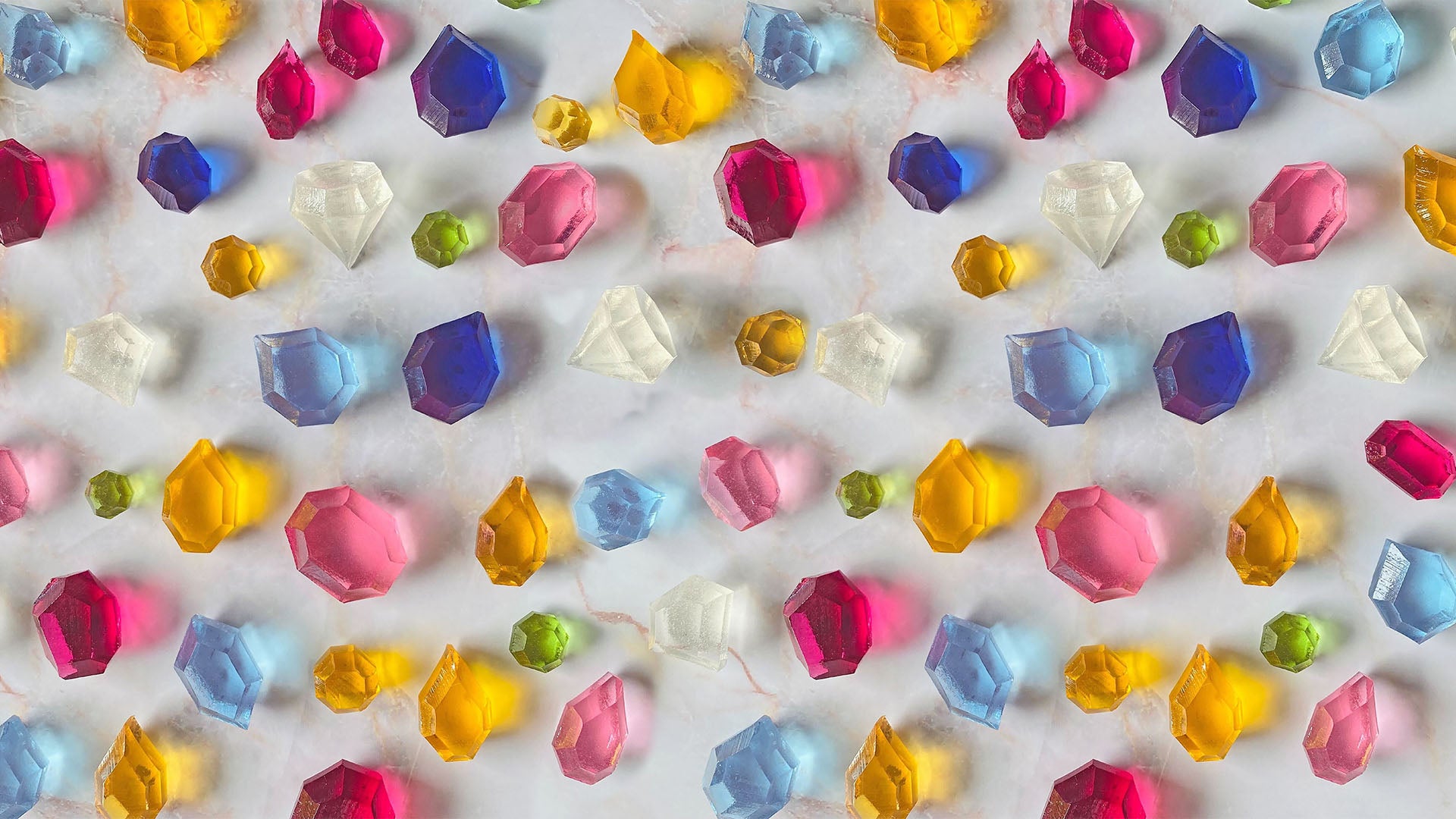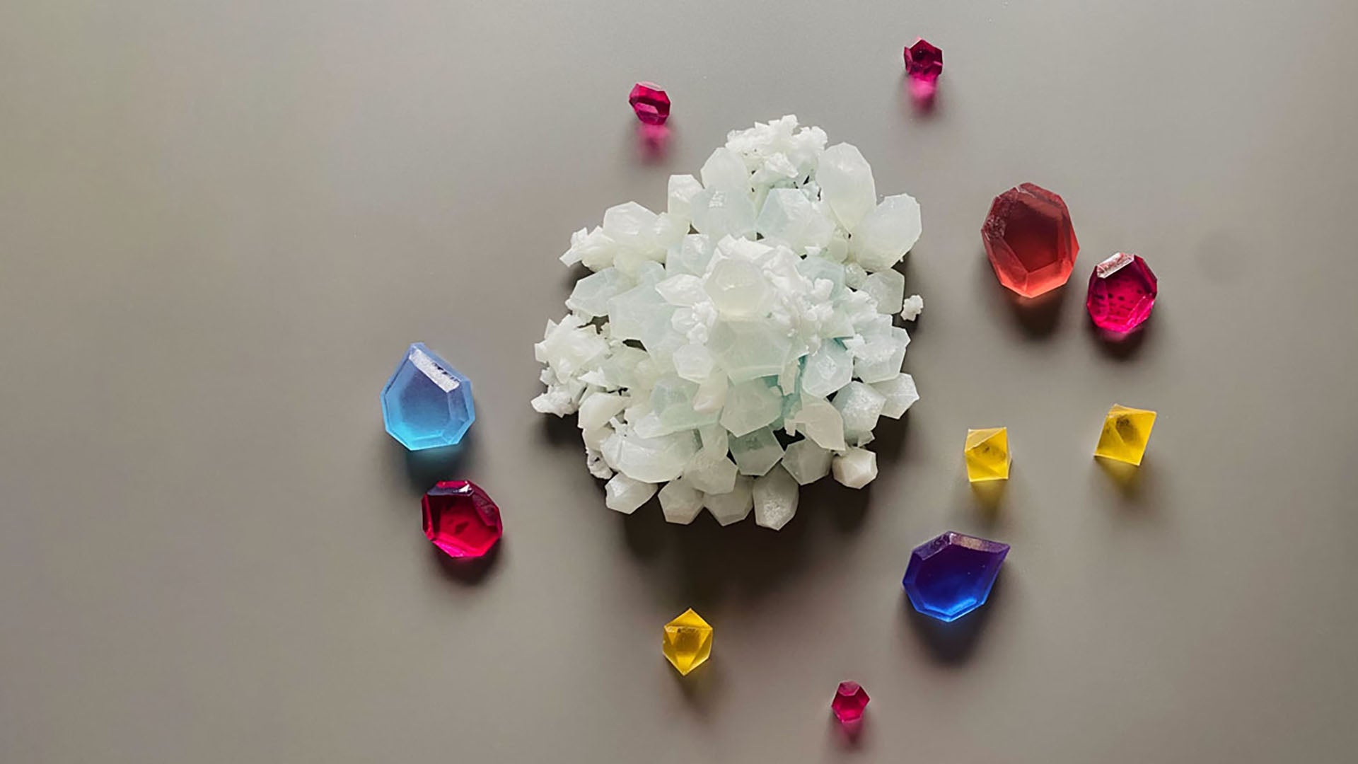 男女問わず石は人々の心を魅了して離しません。石にはそれくらい不思議な力があるのではないでしょうか。ハラペコラボのこうぶつヲカシ(琥珀糖)は、それぞれ石からインスピレーションを得てデザインを考え、宝石のようにカットしたり鉱物のようにカットしたり、色々な手法を組み合わせて創り上げていきます。一粒一粒、全てが手作業で行われ、一切の妥協がありません。宝石のカットは、均等に切り出していく正確な技術が求められます。一方、鉱物のカットはより鉱物に見えるように不均等になるべく自然に近い形を創ることが求められます。今日まで仲間も徐々に増え、職人のデザイン技術はもとより、より宝石に見えるように、より鉱物に見えるようにと、カット技術も日々磨かれここまで進化することができました。