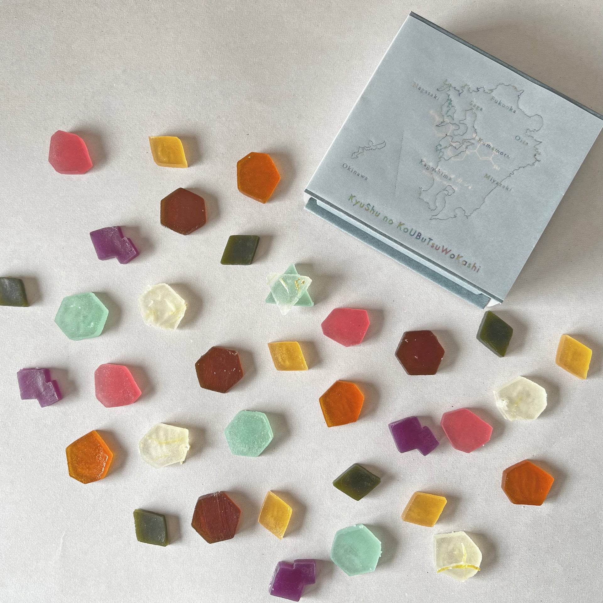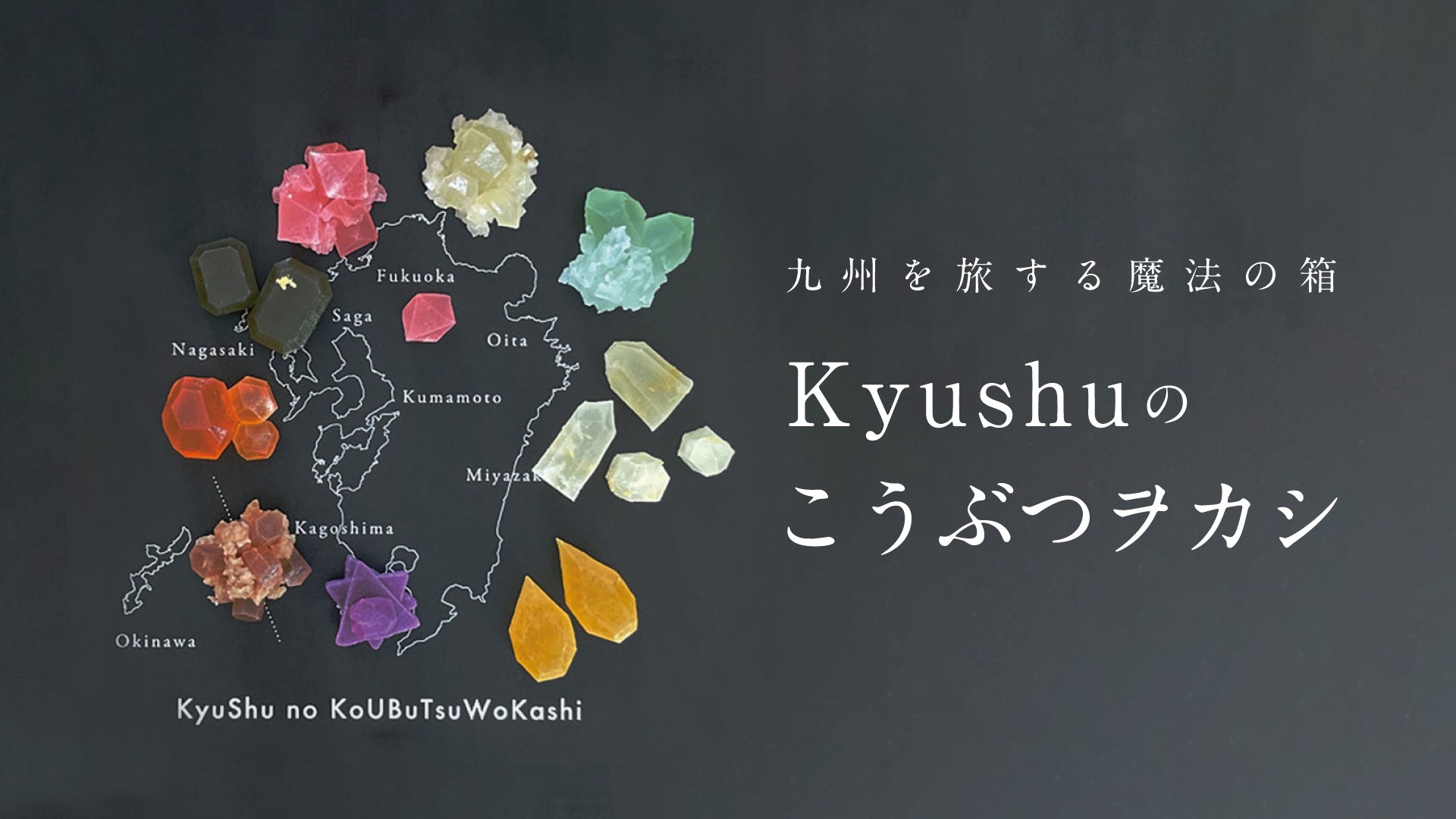 砂糖と寒天を原料にした日本の和菓子である琥珀糖を宝石や鉱物に見立てて切り出したものをこうぶつヲカシとよんでいます。外側を乾燥させ結晶化させることにより外はシャリッと硬く、中は柔らかく光にかざすと光を通し、割った断面はキラキラと光を反射する宝石のような鉱物のような魅力的な砂糖菓子です。みんなの好物とこうぶつ(鉱物)、いとをかしなヲカシ(お菓子)とかけて名付けました。