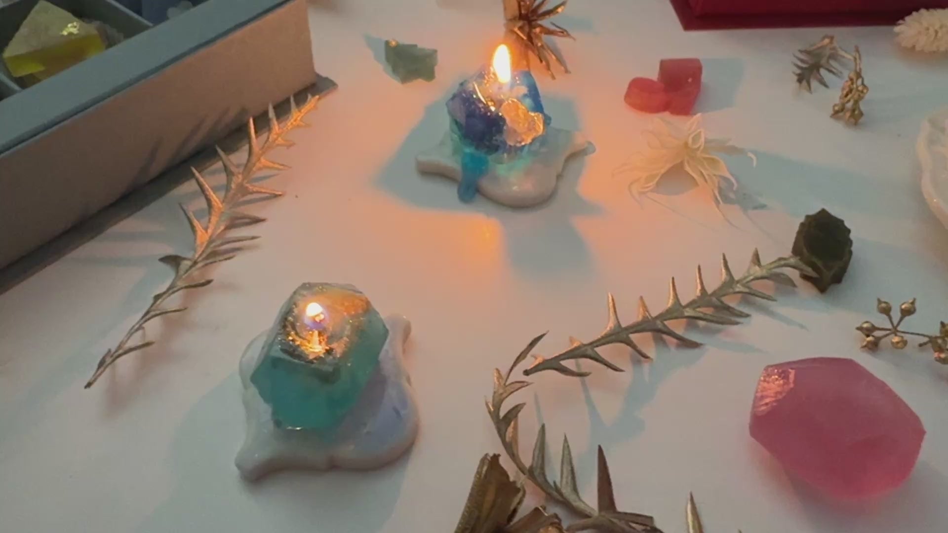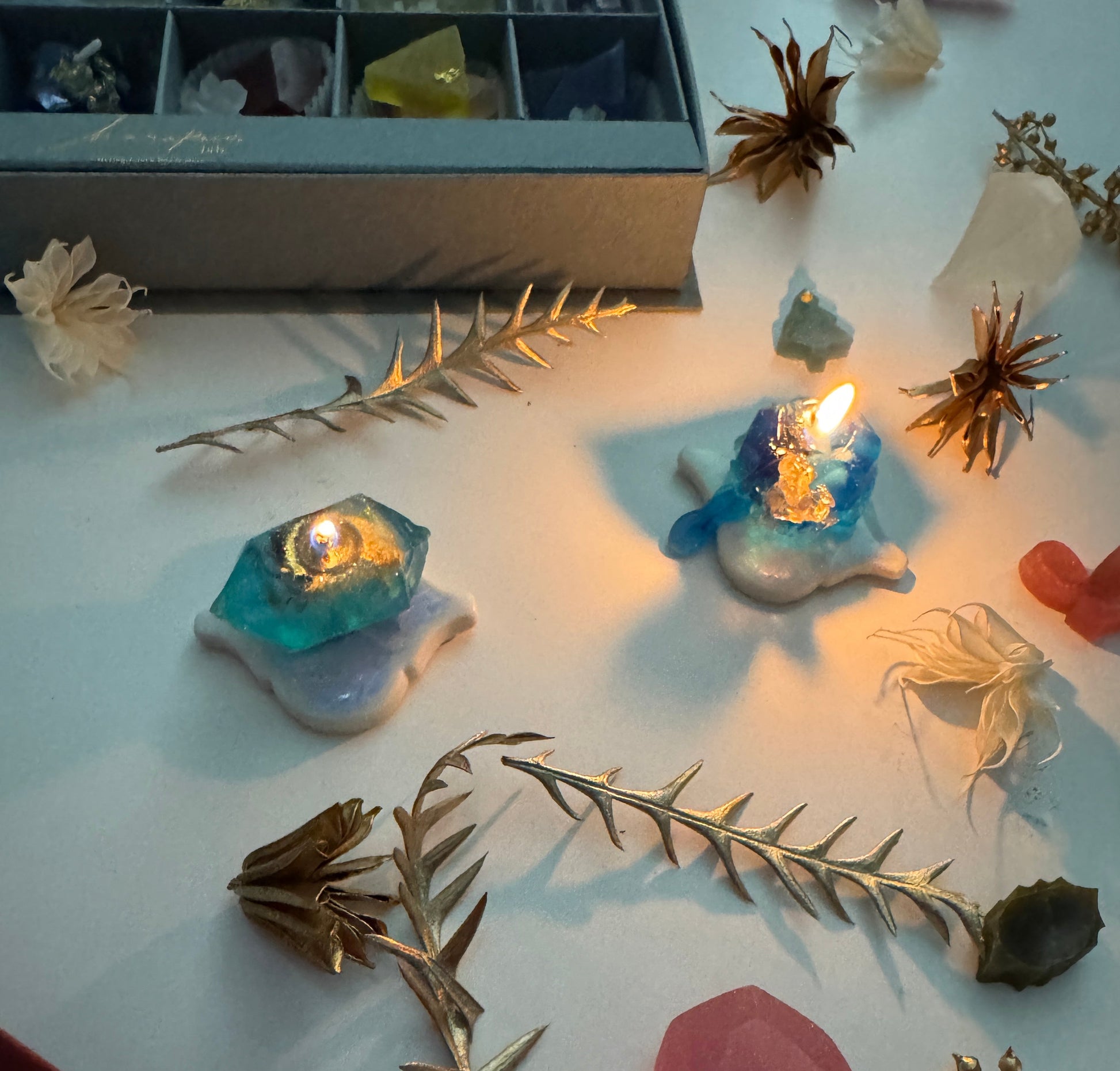 箱の中央には、12月の誕生石ラピスラズリとターコイズをモチーフにした鉱物キャンドルが入っています。