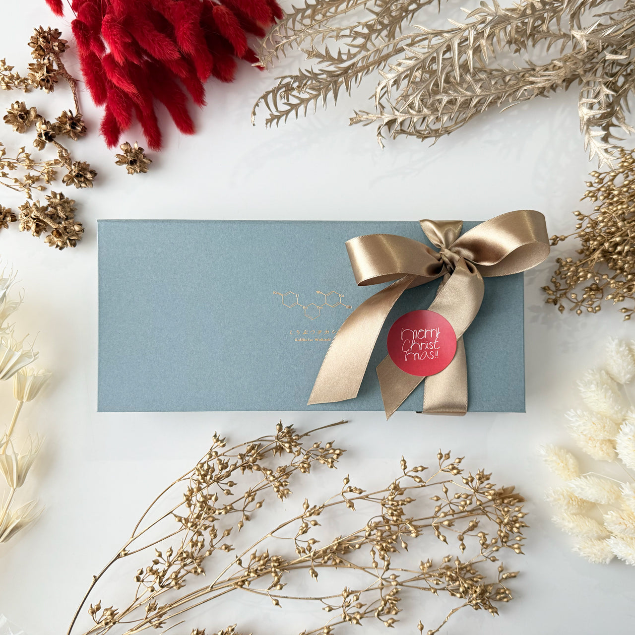 特別な方への贈り物への冬の贈り物にもぴったりの、12粒入りのブルーグレーのお箱にゴールドのリボンをかけてお届けします。