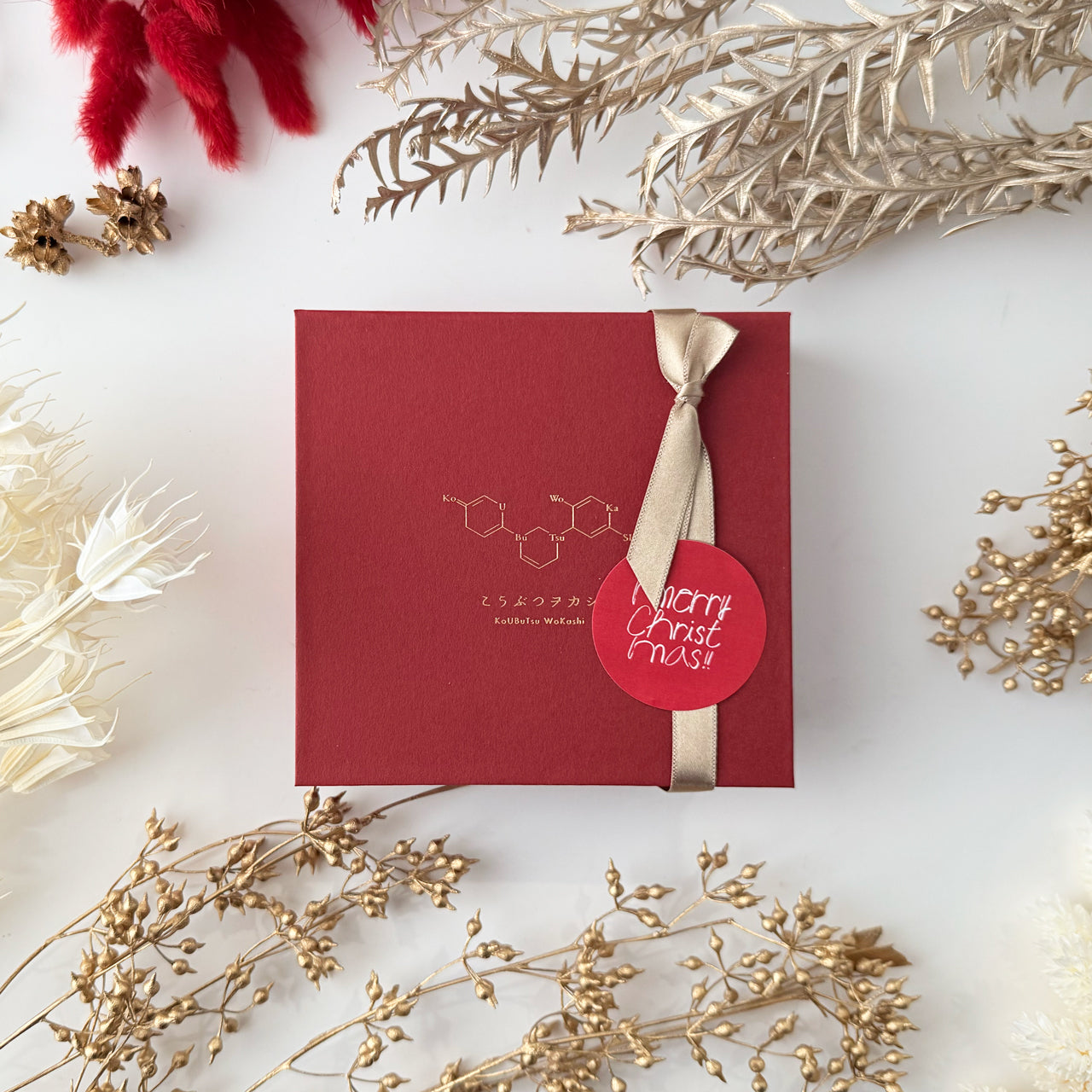 小さな雪の結晶やツリーのモチーフ、クリスマスカラーのドライフラワーを添え、冬の贈り物にぴったりの一箱です。