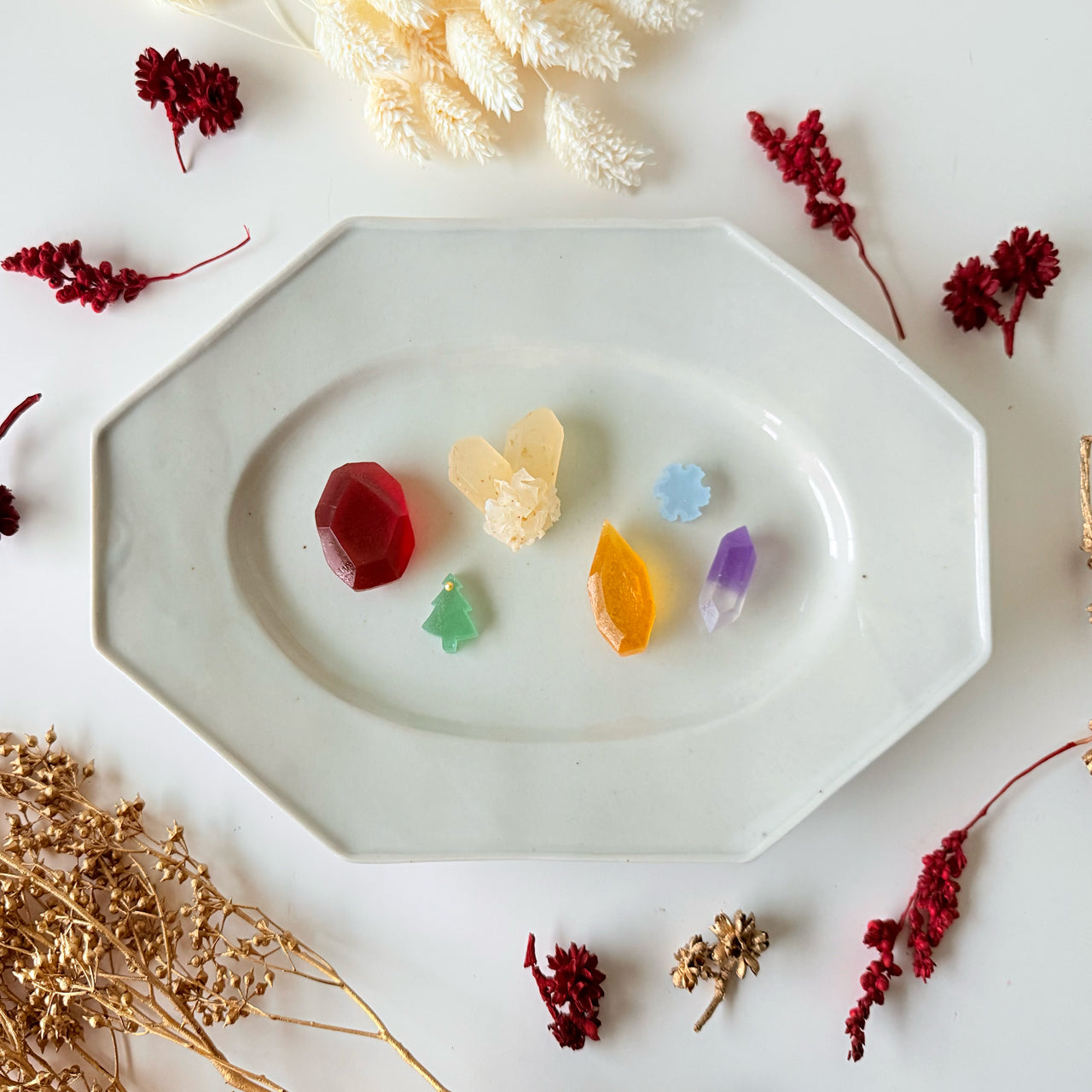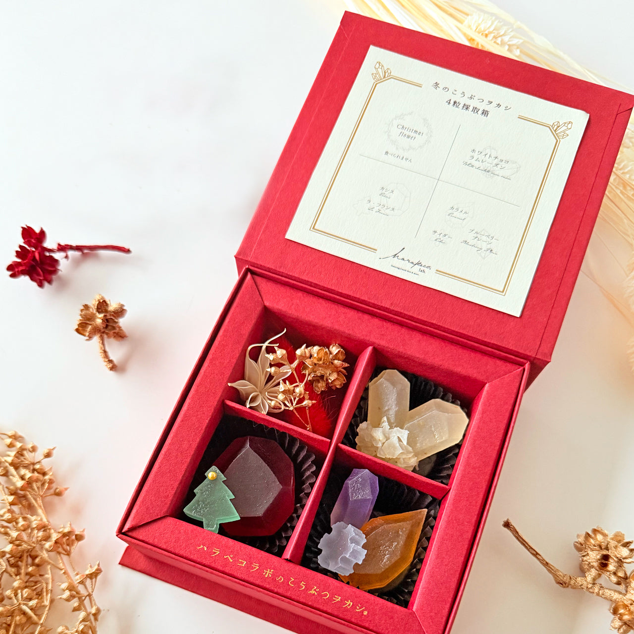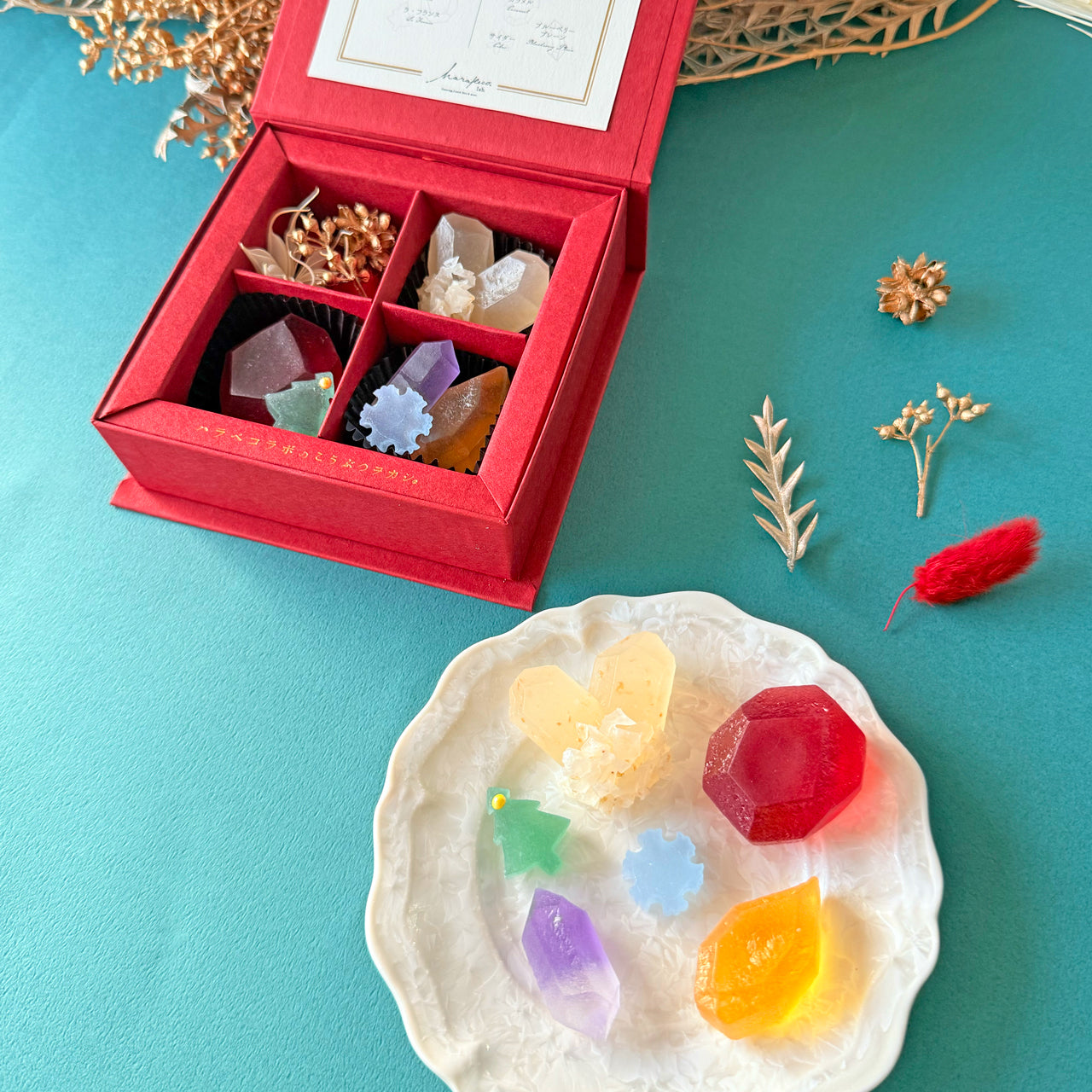 赤いカシスのルビー、ホワイトチョコとラムレーズンが香る水晶、カラメルのトパーズ、ブルーベリーのアメシストなど、神秘的な宝石をモチーフに切り出した琥珀糖を、赤いボックスに詰め合わせました。